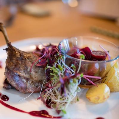 Kacza nóżka z pieca/jabłko z żurawiną/ ziemniaki pieczone/sałatka z buraków Duck leg with apple & cranberry/baked potatoes/